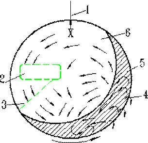 Принцип работы гранулятора показан на рисунок 4. Предварительно смешанные компоненты подают в точку Х, жидкую фазу разбрызгивают над материалом. Мелкие частицы скребком 6 направляются в зону орошения. Крупные агломерированные частицы движутся к поверхности глубокого слоя 4 в нижней части тарелки и выгружаются из нее через борт в нижней части тарелки, а мелкие остаются в слое 5 для дальнейшего агломерирования. Таким образом в слое происходит и классификация гранул.