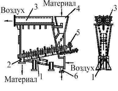 Такие сушилки используют для сушки сульфата аммония, хлористого калия, винифлекса и целого ряда сыпучих и даже пастообразных материалов. Сушилки просты по конструкции (рисунок 151). Материал через бункер 4 подается на наклонную решетку 1, которая может получать колебания от вибратора 5. На сетке происходит псевдоожижение материала воздухом, поступающим снизу. Отработанный воздух проходит две параллельные щели в верхней части камеры и отводится через патрубок 3, а материал выгружается через патрубок 2 и частично через патрубок 6. В промышленности используют сушилки с несколькими камерами.