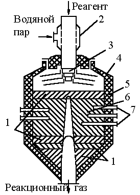 1 - инертная насадка; 2 - смеситель газов; 3 - распределитель газов; 4 - корпус; 5 - футеровка; 6 - слой катализатора; 7 - гильзы для термопар.