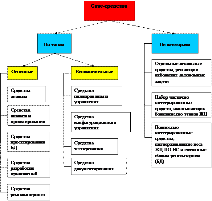 Классификация по типам отражает функциональную ориентацию CASE-средств на те, или иные процессы жизненного цикла. Она включает следующие основные и вспомогательные типы программных средств.