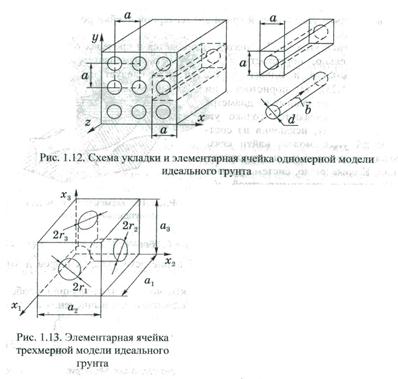 Рис. 1.4. Схема укладки и элементарная ячейка одномерной и трехмерной модели идеального грунта.