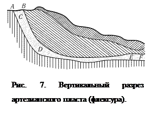 На рис. 7 изображена структурная форма пласта типа флексуры. В области FED пласт залегает полого, а в области DC круто изгибается вверх; верхнее колено флексуры нарушено (например, эрозией) и выходит прямо на дневную поверхность. АВ — область питания, CDEF — область напора. Если водоносный пласт, продолжаясь в направлении EF, выходит дальше на дневную поверхность в пониженной части ее рельефа, то место выхода будет служить областью естественного стока и в таком пласте будем иметь артезианский поток. Если со стороны F пласт выклинивается или ограничен сбросом, то пласт CDEF будет служить неподвижным артезианским бассейном.
