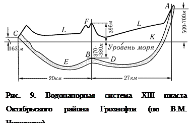 На рис. 9 воспроизведена первоначальная приблизительная схема геолога В.М.Николаева, изображающая водонапорную систему XIII пласта Октябрьского (бывшего Ново-Грозненского) района объединения Грознефти. Область питания пласта А находится в Черных горах, где имеются выходы XIII пласта на высоте 500-700 м над уровнем моря. Область стока С в районе западной группы горячих источников имеет отметку +163 м. Перегиб кровли XIII пласта под промыслами имеет отметку —370-380 м. Горизонтальное протяжение системы порядка 47 км, причем расстояние от нефтепромыслов до области питания равно 27 км, а до области стока — 20 км. На рис. 9 линия L изображает поверхность земли, линия К — уровень моря, F — вершину горы Белик-Барц в Октябрьском районе, на склонах которой расположены нефтепромыслы. Для удобства изображения вертикальный масштаб взят значительно крупнее, чем горизонтальный. Если бы были выдержаны одинаковые масштабы, то область нефтеносности DBE выглядела бы маленьким пузырьком, выдающимся на общем протяжении пластовой водонапорной системы.