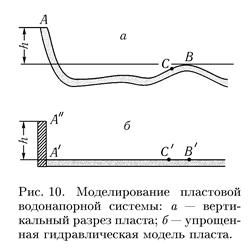 При анализе вертикальных разрезов (проведенных вдоль по падению пластов) типовых пластовых в донапорных систем легко заметить следующую важную характерную особенность: вертикальные их размеры значительно меньше горизонтальных. В самом деле, глубина залегания разрабатываемых водоносных и нефтеносных пластов редко превосходит 2-3 км, а протяжение пласта от его выходов на дневную поверхность до области разработки измеряется десятками, а иногда и сотнями километров. При гидродинамическом решении очень многих задач подземной гидромеханики: при выяснении особенностей работы отдельных скважин, при решении проблемы взаимодействия скважин, при выяснении законов изменения пластового давления в области нефтеносности в зависимости от темпов отбора жидкости и т.д. — вполне допустима некоторая схематизация строения пластовой водонапорной системы от области разработки до области питания.