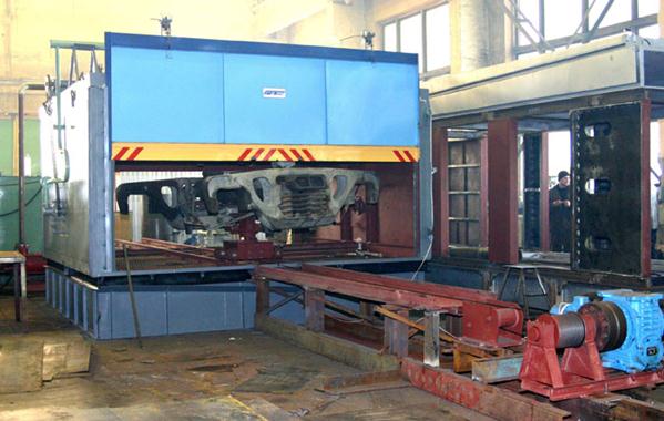 Каждая камера (рисунок 4.29) оборудована механизмом подъема и опускания дверей, конвейером для ввода и вывода из камеры каркаса, устройством для подъема и вращения каркаса тележки в процессе обмывки.