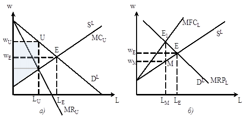 Рис. 2. Несовершенная конкуренция на рынке труда: а – монополия профсоюза; б – монопсония
