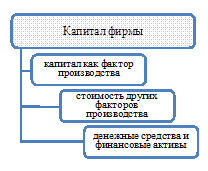 Капиталом фирмы называется стоимостная оценка всего имущества, принадлежащего ей. Таким образом, в величину капитала фирмы помимо стоимости машин, оборудования, сооружений и т.п., то есть собственно фактора капитал, включается: