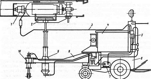 1 – гидравлический переносной пресс, 2 – площадка для размещения поглощающего аппарата, 3 – шланг, 4 – аккумуляторные батареи, 5 – пульт управления, 6 – шасси электрокара, 7 – гидропривод (насосная станция), 8 – поворотная консоль, 9 – телескопический гидравлический подъемник, 10 – концевая гидравлическая опора