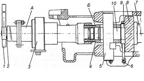 А – гидравлическая часть, Б – отжимное устройство, 1 – вороток,