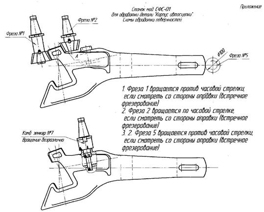 Автосцепка укладывается в «пастель» на станине станка путем захвата специальной траверсой и фиксируется. Обработка производится путем подбора фрез, оборотов шпинделя и глубины врезания.