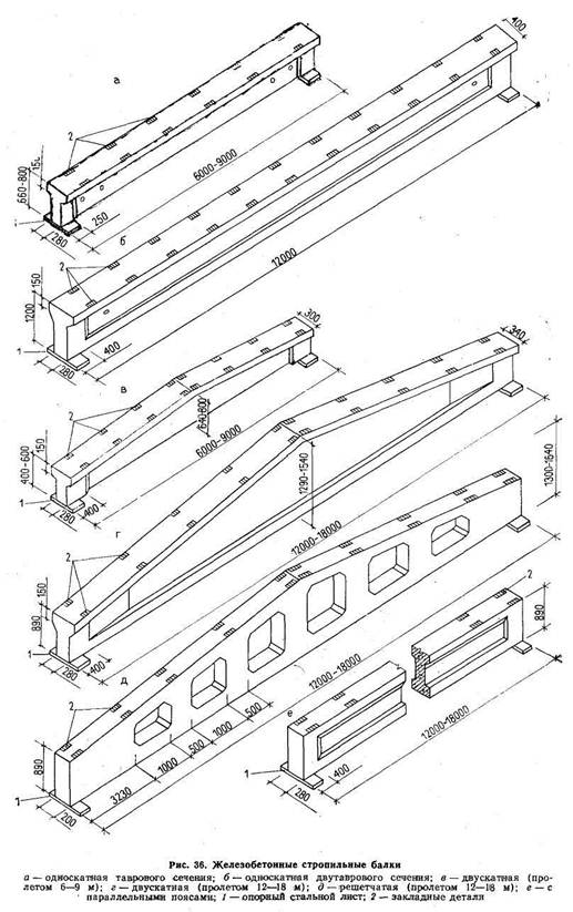 Стропильные балки изготовляют из бетона марки 300—500 и перекрывают пролеты 6, 9, 12 и 18 м (при шаге колонн 6 м). Название балок зависит от очертания верхнего 'пояса.