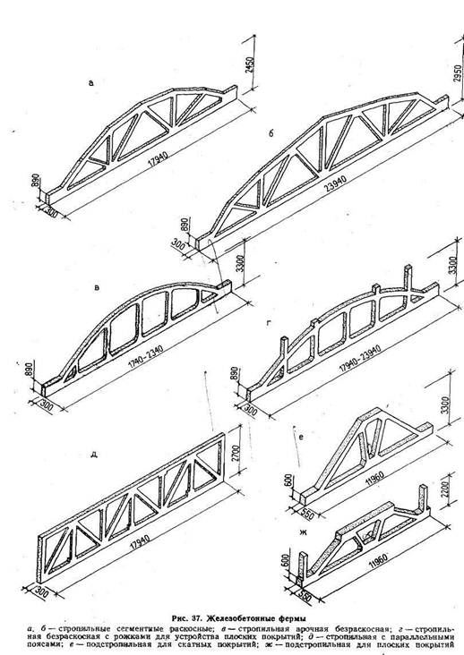 Стропильные фермы изготовляют из бетона марок 300—500. Ими перекрывают пролеты 18 и 24 м. Фермы различают по виду решетки и очертанию верхнего пояса.