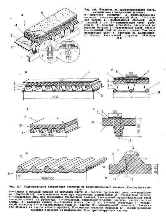 Профилированные стальные листы (толщиной 0,8—1 м, высотой ребер 60—80 мм) (рис. 106) закрепляют самонарезающими болтами к прогонам. Листы настила •укладывают внахлестку и соединяют комбинированными заклепками. По верху настила устраиваются пароизоляция, теплоизоляция (из пенополистирольных или жестких минераловатных плит) и рулонная кровля.