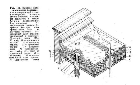 Водонаполненные покрытия (рис. 113) имеют такую же конструкцию, как и обычные плоские кровли с внутренним водоотводом. Рулонный ковер кровли — четырехслойный из толь-кожи или гидроизола на дегтевой или битумной мастике. В летнее время такая мастика, расплавляясь, заполняет мелкие трещины. Дегтевые мастики обладают также антисептическими свойствами, предохраняющими рулонный ковер от загнивания и прорастания на нем семян растений. Защитное покрытие из слоя гравия, втоплен-ного в кровельную мастику, предохраняет рулонный ковер от механических повреждений.