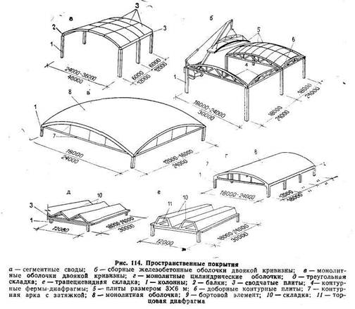 монолитные оболочки (рис. 114, в, г), возводимые с применением передвижной опалубки. Такие покрытия применяют в районах с высокой сейсмичностью;