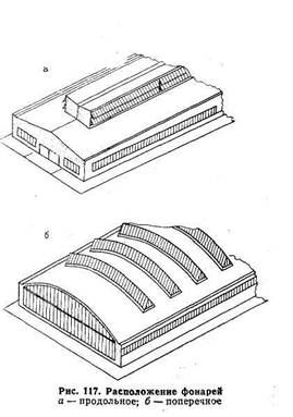 2. По расположению (рис. 117) фонари бывают: продольные, устраиваемые в большинстве современных зданий; поперечные, имеющие более сложную конструкцию, чем продольные, и сравнительно редко применяемые в строительстве промышленных зданий.