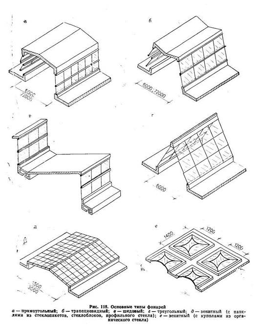 3. По форме поперечного сечения (рис. 118) фонари разделяют на: прямоугольные, наиболее простые и надежные в эксплуатации; трапециевидные с наклонными переплетами; шедовые с остеклением, обращенным на северную сторону, исключающим освещение помещений прямым солнечным светом; треугольные с глухими, обогреваемыми изнутри переплетами; зенитные с остеклением в виде светопрозрачных панелей; колпаков и сводов.