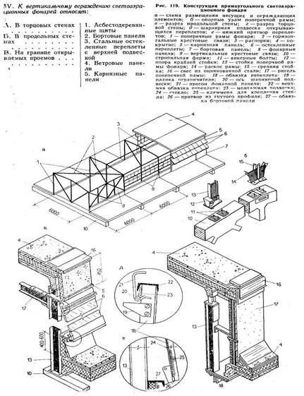 1. По назначению фонари различают на: световые с остекленными неоткрывающимися переплетами для естественного освещения; аэра-ционные (без переплетов) для вентиляции цехов с избытками тепла, выделением пыли, дыма и газа; све-тоаэрационные с открывающимися остекленными переплетами для освещения и проветривания.