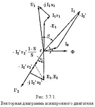 Используя три основных уравнения двигателя, построим векторную диаграмму, которая, будет несколько напоминать диаграмму трансформатора (рис. 5.7.1).