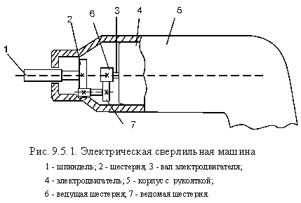 Трехфазные преобразователи тока, например типа ПЭ-9403 с потребляемой мощностью 1,8 кВт при первичном напряжении 380 / 220 В развивают вторичное номинальное напряжение 36 ± 10% В. Преобразователь тока типа ПЭ-9401 потребляет мощность до 5,6 кВт при таких же напряжениях. Преобразователи обоих типов - электромагнитные. На рис. 9.5.1 показан продольный разрез электрической сверлильной машины типа ПЭ-1012, предназначенной для сверления отверстий диаметров до 15 мм в сталях средней твердости, цветных металлах и других материалах. Машина приводится трехфазным асинхронным двигателем повышенной частоты напряжением 36 В.