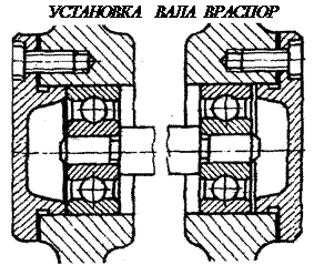 Короткие валы при слабом нагреве можно устанавливать на подшипники враспор, когда один подшипник фиксирует осевое смещение вала в одну сторону, а другой – в другую. Схема с фиксацией подшипников враспор удобна в монтаже, но требует жёстких допусков на линейные размеры и опасна возможным защемлением тел качения при нагреве. При установке враспор для радиальных подшипников оставляют осевой зазор, а для радиально-упорных предусматривают осевую регулировку.