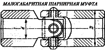 Малогабаритные шарнирные муфты стандартизованы в диапазоне диаметров 8 ¸ 40 мм и моментов 1,25 ¸ 128 кГм. Крестовина выполнена в виде параллелепипеда. Шарнир образуется с помощью вставных осей, одна из которых длинная, а другая состоит их двух коротких втулок, стянутых заклёпкой. Конструкция весьма технологична.