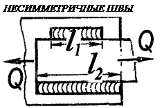Если швы несимметричны, то нагрузка на фланговые швы распределяется по закону рычага Q1,2 = Q l1,2 / ( l1 + l2 ), где l1 и l2 – длины швов.