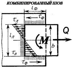 Комбинированные лобовые и фланговые швы рассчитывают на основе принципа распределения нагрузки пропорционально несущей способности отдельных швов. При действии силы Q касательные напряжения равны: