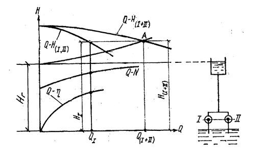 А - рабочая точка; Q-H(I,П) - характеристика одного насоса из двух параллельно работающих; Q-H(I+П) – характеристика двух параллельно работающих насосов; Н г- геометрическая высота подъема воды; QI и НI - соответственно подача и напор в системе при работе одного насоса из двух параллельно работающих; Q(I+П) и H(I+П) – соответственно подача и напор в системе при работе двух параллельно работающих насосов.