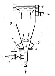 1 - трубопровод подачи воды; 2 и 5 – трубы подачи реагентов; 3 – диффузор; 4 – периферийный желоб.