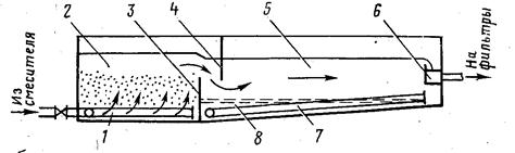 1 – дырчатые распределительные трубы; 2 – нижняя часть камеры хлопьеобразования; 3 – водослив; 4 – перегородка; 5 – зона осаждения; 6 – водосборный желоб; 7 - система дырчатых труб; 8 – зона накопления и удаления осадка.