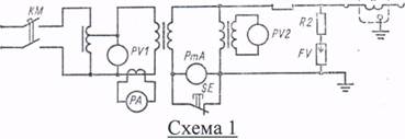 КМ - автоматический выключатель; ТИУ - регулировочная колонка; Т - испытательный трансформатор; РА - амперметр для измерения тока на стороне низкого напряжения; РУ1, РУ2 - вольтметры; РmА - миллиамперметр для измерения тока утечки испытываемой изоляции; SЕ - кнопка, шунтирующая миллиамперметр для его защиты от перегрузок; R1 - резистор для ограничения