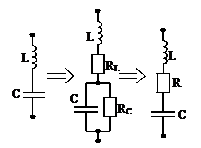 Для изучения свойств контура нужно катушку и конденсатор представить схемами замещения соответственно – (L – RL) и (C – RC). Для упрощения анализа свойств делают преобразования всей схемы в последовательную схему, где R – сопротивление потерь контура, зависящее от сопротивлений RL и RC.