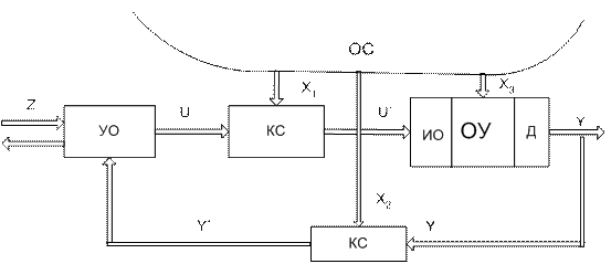 На рис. 1 приведена структурная схема автоматизированной системы управления, находящейся под воздействием окружающей среды. Слева направо обозначены воздействия на объект управления, Справа налево – сигналы обратной связи. В объекте управления ОУ обычно выделяют исполнительные органы ИО и датчики Д. Существенным фактором, который необходимо учитывать в системах управления является воздействие окружающей среды ОС (показано стрелками сверху вниз). Эти возмущающие воздействия могут исказить информацию, циркулирующую в системе (внести помеху в сигнал управления или сигнал обратной связи). Поэтому в общем случае U≠U’ и это вызывает проблемы в управлении, особенно в случае, когда управляющий орган удален от объекта управления на значительное расстояние, как это имеет место в устройствах электроснабжения железных дорог.