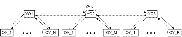 На рис.7. приведена рассредоточенная одноуровневая централизованная схема. Такая схема управления характерна для управления некоторыми объектами железнодорожного транспорта. Каждый управляющий орган управляет своими объектами управления, но при принятии решения возникает необходимость кроме информации о состоянии своих объектов управления учитывать информацию о действиях и состояниях других управляющих органов. В качестве такого примера с большими упрощениями можно рассматривать взаимодействие энергодиспетчера участка электроснабжения ЭЧЦ с поездным диспетчером и диспетчером энергосистемы.