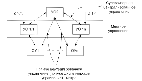 Такая схема управления характерна для реальных сложных систем, к которым можно отнести железнодорожный транспорт в целом, или отдельную железную дорогу в частности. Схема такого управления приведена на рис. 8. Имеется управляющий орган ОУ2, расположенный в вершине иерархической системы. Он обладает полномочиями управления ему подчиненными управляющими органами УО1.1, …, УО1.n, расположенными на местном уровне управления (супервизорное централизованное управление). Каждый управляющий орган местного управления имеет свои собственные задания Z1.1,…,Z1.n, отрабатывая которые управляет своими объектами управления с учетом заданий, получаемых от вышерасположенного органа управления. Кроме того управляющий орган ОУ2 может непосредственно управлять объектами управления нижнего уровня (прямое централизованное управление).