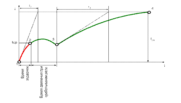 В течение времени задержки ток нарастает до значения тока срабатывания Iср, при котором электромагнитный момент начнет превышать момент пружины и моменты сил трения. Это время может быть определено по формуле