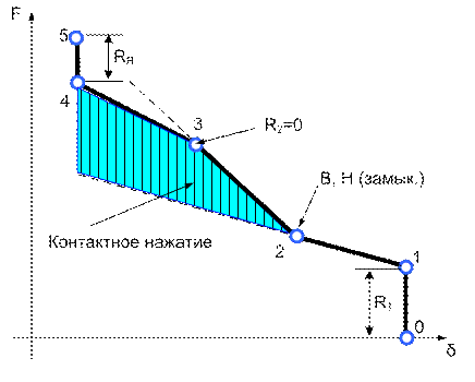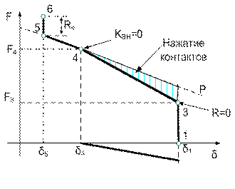 Рассмотрим поведение системы при увеличении результирующего усилия F воздействующего на якорь. Усилие контакт-пружины В зависит от величины зазора d, поэтому возрастание F на участке 1-3 приводит только к уменьшению реакции опоры R, перемещения не происходит. В точке 3 реакция опоры равна нулю. При дальнейшем росте усилия F начинается перемещение якоря и уменьшение зазора d. Контакт-пружина B через шток начинает разгружаться и уменьшать давление на нижнюю контакт-пружину Н. В точке 4 контактное нажатие KВН =0. Дальнейшее увеличение усилия F ведет к уменьшению зазора и соответственно к увеличению воздействия K1 верхней контакт-пружины на якорь. В точке 5 якорь через диамагнитную прокладку касается сердечника и изменение зазора больше не происходит. Дальнейший рост усилия F приводит к росту реакции на якорь со стороны сердечника RЯ. Участки характеристики 1-3 и 5-6 обеспечивают виброустойчивость реле.