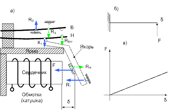 на якорь со стороны нижней контакт-пружины Н усилие K1, которое уравновешивается реакцией R1 ограничителя, реакция со стороны сердечника RЯ отсутствует;