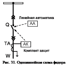 На рис. 31 приведена схема фидера, оснащенная комплектом автоматики АА и релейной защиты АК. Для данной схемы на рис. 32 приведена принципиальная схема вторичных цепей, обеспечивающих управление выключателем. Питание схемы управления осуществляется от шин управления. Привод выключателя содержит двигатель М, который осуществляет завод пружин, обеспечивающей цикл «отключение» - «включение» - «включение». Двигатель включается от конечного выключателя S1 при переходе пружины в нерабочее (несжатое) состояние. Включающий электромагнит YAC получает питание при нажатии кнопки оперативного включения SBC, если пружина привода будет готова к работе (контролируется контактом S2), а выключатель Q отключен. Автоматическое включение будет производиться выходным контактом