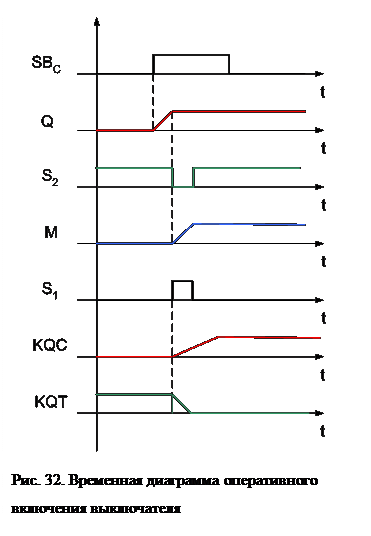 Для анализа работы схем широко применяются временные диаграммы. Для рассматриваемой схемы на рис.32 показана временная диаграмма включения оперативного включения выключателя. При этом показан случай, когда это приводит пружину в нерабочее состояние и двигатель М осуществляет завод пружины.