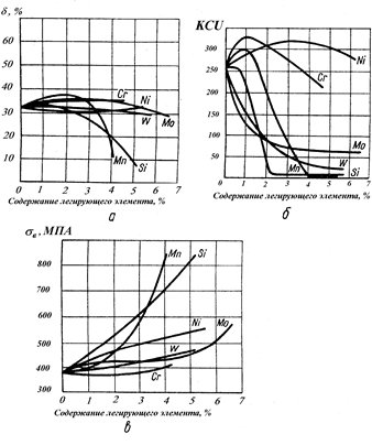 На рис. 83 показаны изменения свойств феррита (твердость, ударная вязкость и относительное удлинение) при растворении в нем различных элементов. Как видно из диаграмм, хром, молибден, вольфрам упрочняет феррит меньше, чем никель, кремний и марганец. Молибден, вольфрам, а также марганец и кремний при содержании более 1 % снижают вязкость феррита. Хром снижает вязкость значительно слабее перечисленных элементов, а никель не снижает вязкости феррита вплоть до 8 %.