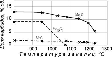 На рис. 111 представлены закономерности растворения карбидов от температуры. Видно, что Ме23С6, в котором находится почти весь хром, начинает растворяться при 950 о С и он полностью переходит в твердый раствор при температурах около 1080 о С. карбид (W, Mo, Cr)6С, где находятся легирующие элементы, обеспечивающие красностойкость, начинает растворяться при температурах ~ 950 о С и заканчивается его растворение при плавлении стали.