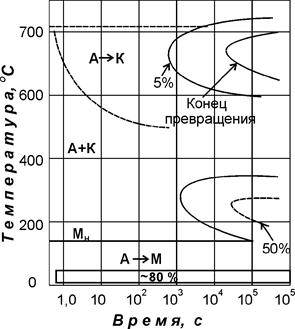 К), в результате которого аустенит обедняется тугоплавкими элементами: вольфрамом и молибденом. Эта область определяет критическую скорость охлаждения. Если кривая охлаждения будет пересекать область А