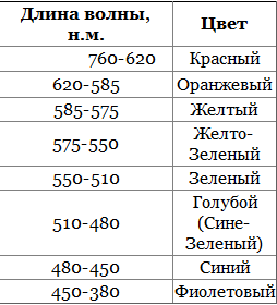 2. Волны с длиной волны менее 380 н.м. - это ультрафиолет, а с длиной более 760 н.м. - это инфракрасный свет. В таблице 1 показана зависимость цвета от длины волны видимого спектра.
