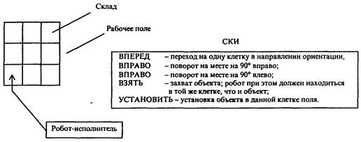 В качестве примера (рис. 2.1) рассмотрим исполнителя-робота, работа которого состоит в собственном перемещении по рабочему полю (квадрату произвольного размера, разделенному на клетки) и перемещении объектов, в начальный момент времени находящихся на «складе» (правая верхняя клетка).