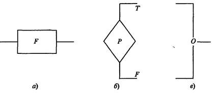 На рис. 2.2 изображены «функциональная» (a) вершина (имеющая один вход и один выход); «предикатная» (б) вершина, имеющая один вход и два выхода (в этом случае функция Р передает управление по одной из ветвей в зависимости от значения Р (Т, т.е. true, означает «истина», F, т.е. false - «ложь»); «объединяющая» (в) вершина (вершина «слияния»), обеспечивающая передачу управления от одного из двух входов к выходу. Иногда вместо Т пишут «да» (либо знак +), вместо F- «нет» (либо знак -).