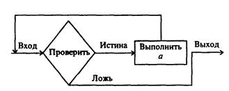 Цикл начинается с проверки логического выражения. Если оно истинно, то выполняется «a», затем все повторяется снова, пока логическое выражение сохраняет значение «истина». Как только оно становится ложным, выполнение операций «а» прекращается и управление передается по программе дальше.