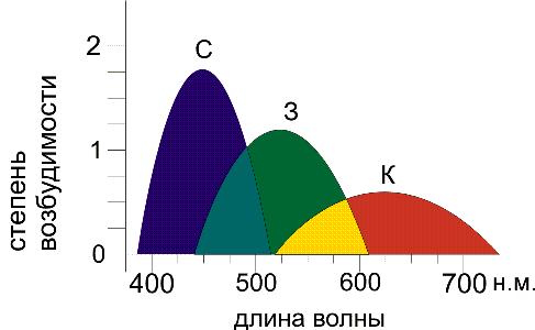 Из рисунка видно, что синий цвет обладает самой высокой возбудимостью. Это значит, что при уменьшении освещенности синий цвет пропадает самым последним. Подробнее: при нормальном дневном освещении рассеянным светом хорошо воспринимаются все цвета спектра. При уменьшении освящения цветовой тон начинает смещаться. Остаются только красный, зеленый, синий, затем и они исчезают. Синий постепенно переходит в белесый, красный - в черный. Это явление называется явление Бецольда-Брюнне. При увеличении яркости происходит сдвиг светового тона к желтому и голубому (явление Эбнея). При освещении различными источниками света, а именно при свете лампы накаливания (теплый цвет) длинноволновые цвета становятся теплее и насыщеннее, светлота их повышается; коротковолновые (от голубого до фиолетового) - тускнеют, теплеют, становятся сероватыми (приглушенными). При свете люминесцентных ламп выигрывают коротковолновые цвета и холодные, зеленые: их насыщенность и яркость возрастает. Длинноволновые цвета теряют насыщенность, холоднеют и могут быть искажены фиолетовым налетом.