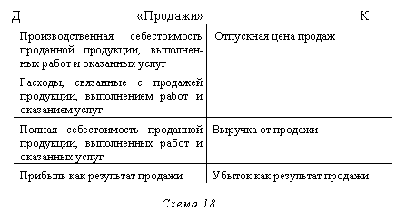 Особенностью отражения операций на счете "Продажи" является то обстоятельство, что на нем один и тот же хозяйственный процесс отражаются как по дебету, так и по кредиту счета, но в двух разных оценках - по дебету фактическая себестоимость проданной продукции, по кредиту - отпускные цены на эту же продукцию. Сопоставление двух оценок и позволяет выявить финансовый результат от продажи (схема 18).